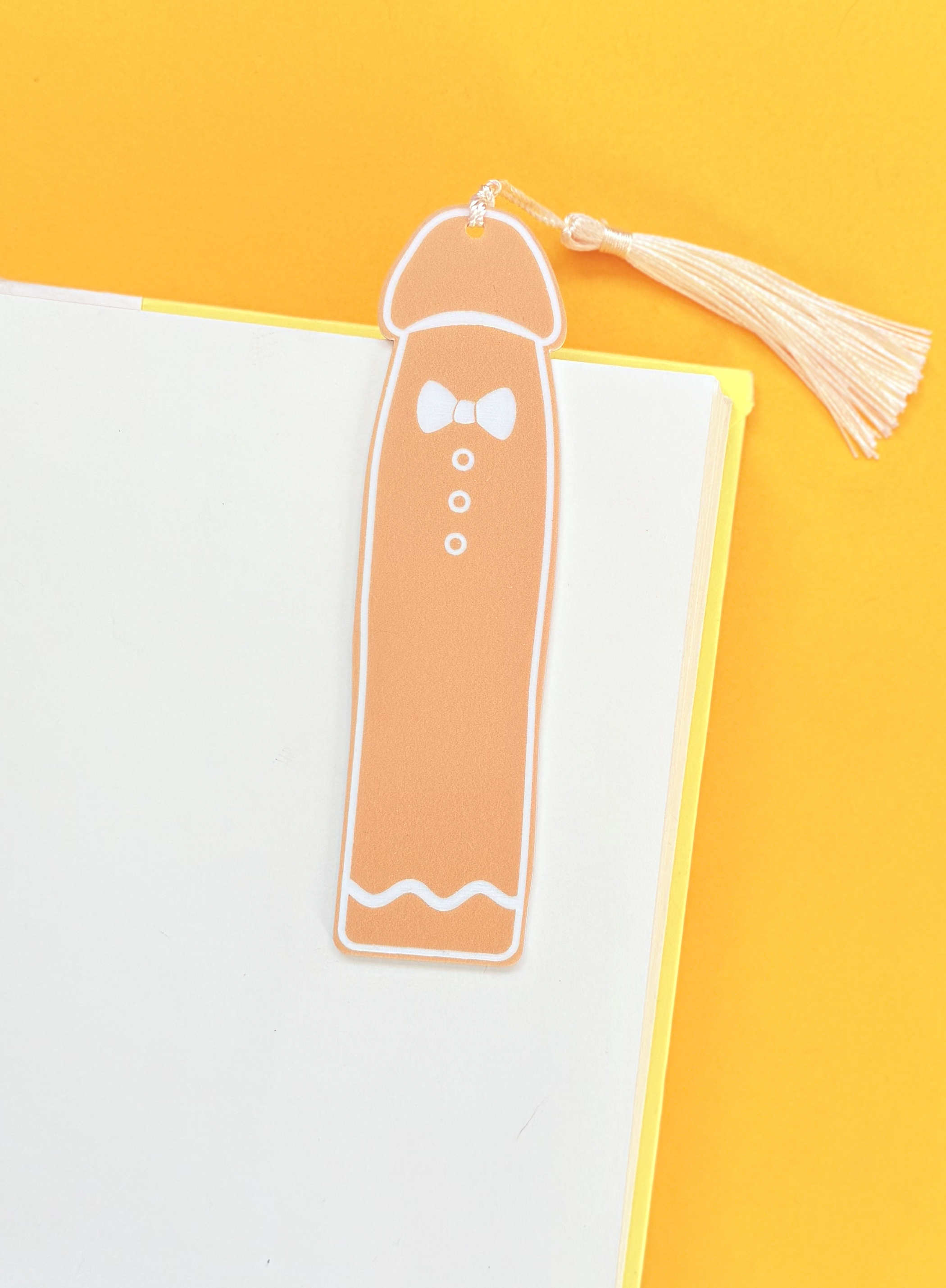 Gingerbread Man Cockmark made out of tan and white acrylic. Backside is white. Topped with a splooging cream tassel and shimmied in our iconic hand sleeve.
