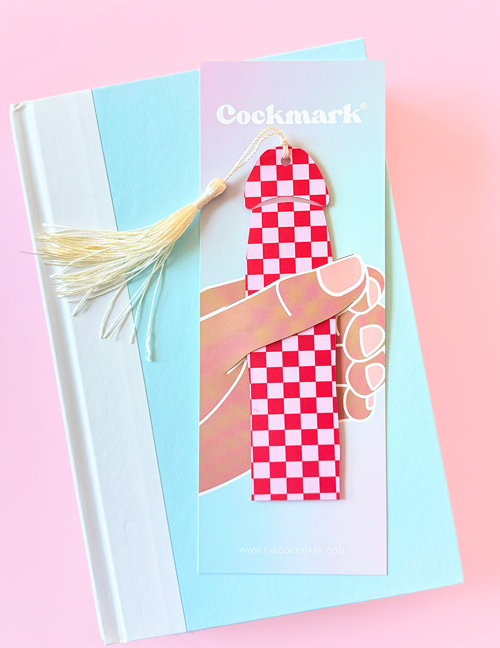 Only available for a limited time until sold out! Pink and red checkered acrylic Cockmark, visible from both sides. Topped with cream tassel and placed in our iconic hand sleeve.