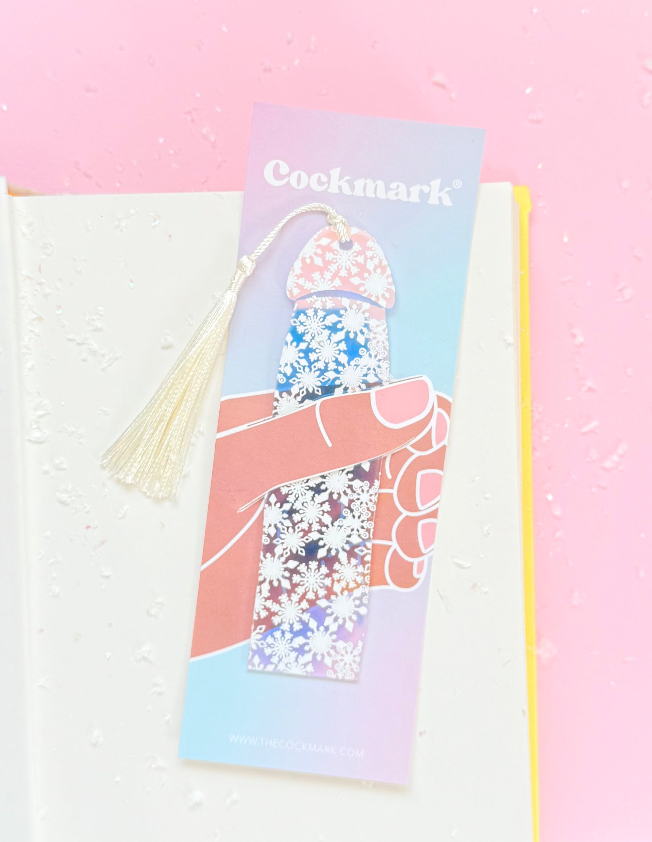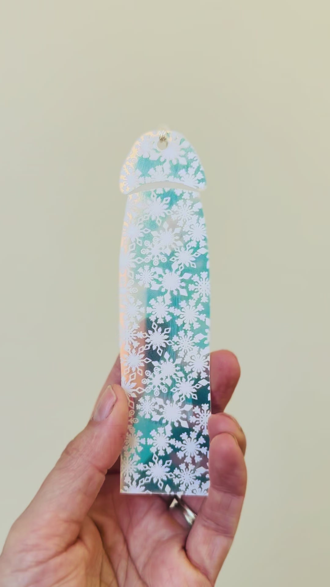 Holographic clear acrylic, printed with white snowflakes! Design is visible on both sides. Topped with a splooging cream tassel and shimmied in our iconic hand sleeve.